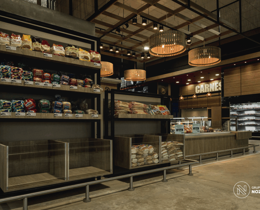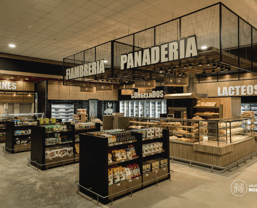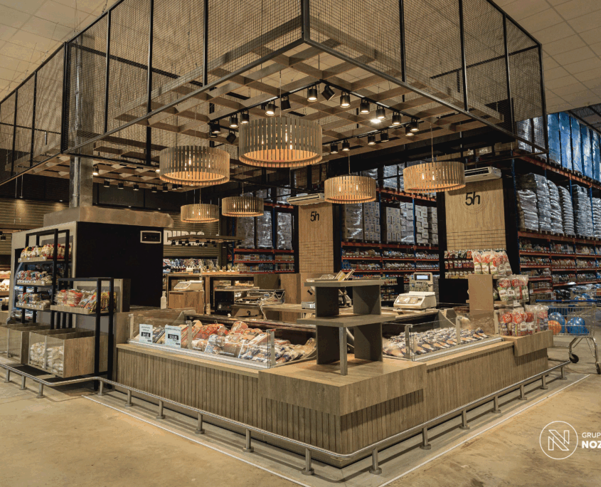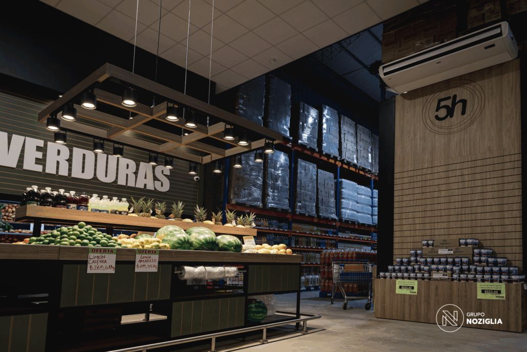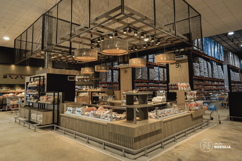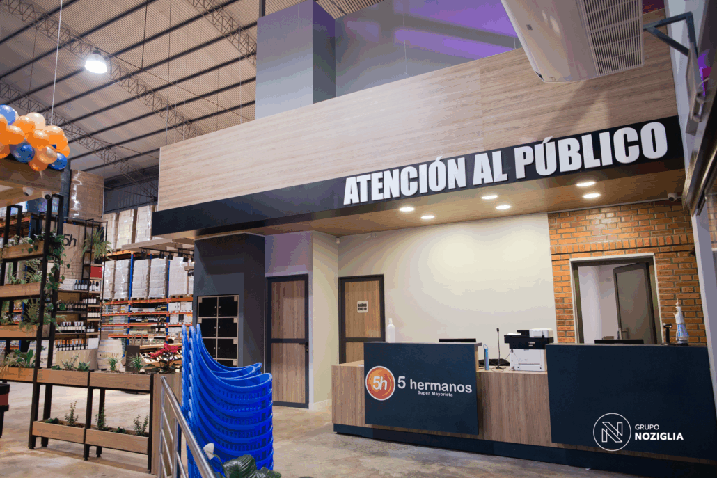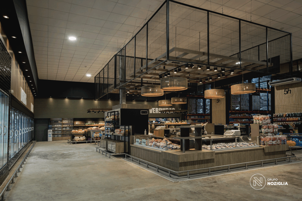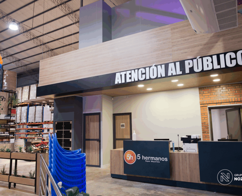 Este proyecto que realizamos para 5 Hermanos Supermercados . Desarrollamos el diseño arquitectónico, la fabricación de mobiliario personalizado en conjunto con NOZÁ Fábrica de Mobiliario, la instalación de revestimientos junto a TEKÓ Placas y Herrajes, el equipamiento y el armado de racks de almacenamiento con la ayuda de Noziglia Equipamientos; para el nuevo local de 5 Hermanos. También se replicó el mobiliario personalizado para otros locales de la línea de supermercados con el fin de mantener una imagen de marca consistente.