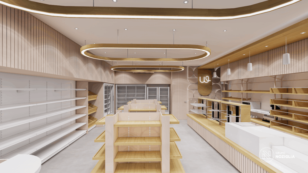 El negocio ofrece una gran variedad de productos para la venta, entre panificados y productos de almacén, por lo que buscamos una exhibición armónica y distintiva de los mismos. Esto se logró con una distribución estratégica del mobiliario y de la disposición de los sectores del espacio comercial.